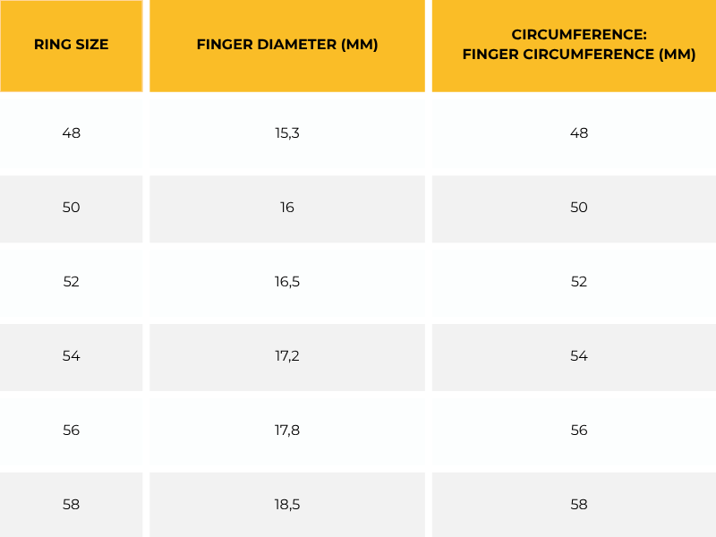 Our rings follow European size standards and are carefully checked to ensure their accuracy. Measure your finger size or the inner diameter of one of your rings and compare with the table below.